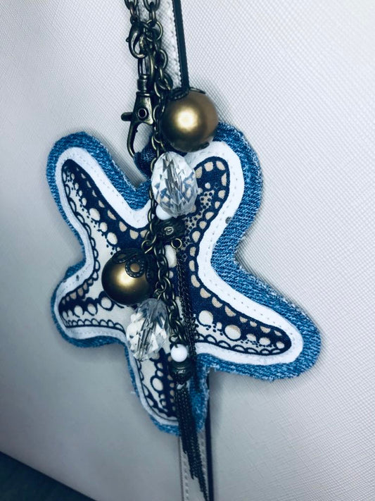 Ocean inspired upcycled denim and vintage necklace bag charm with seastar pendant