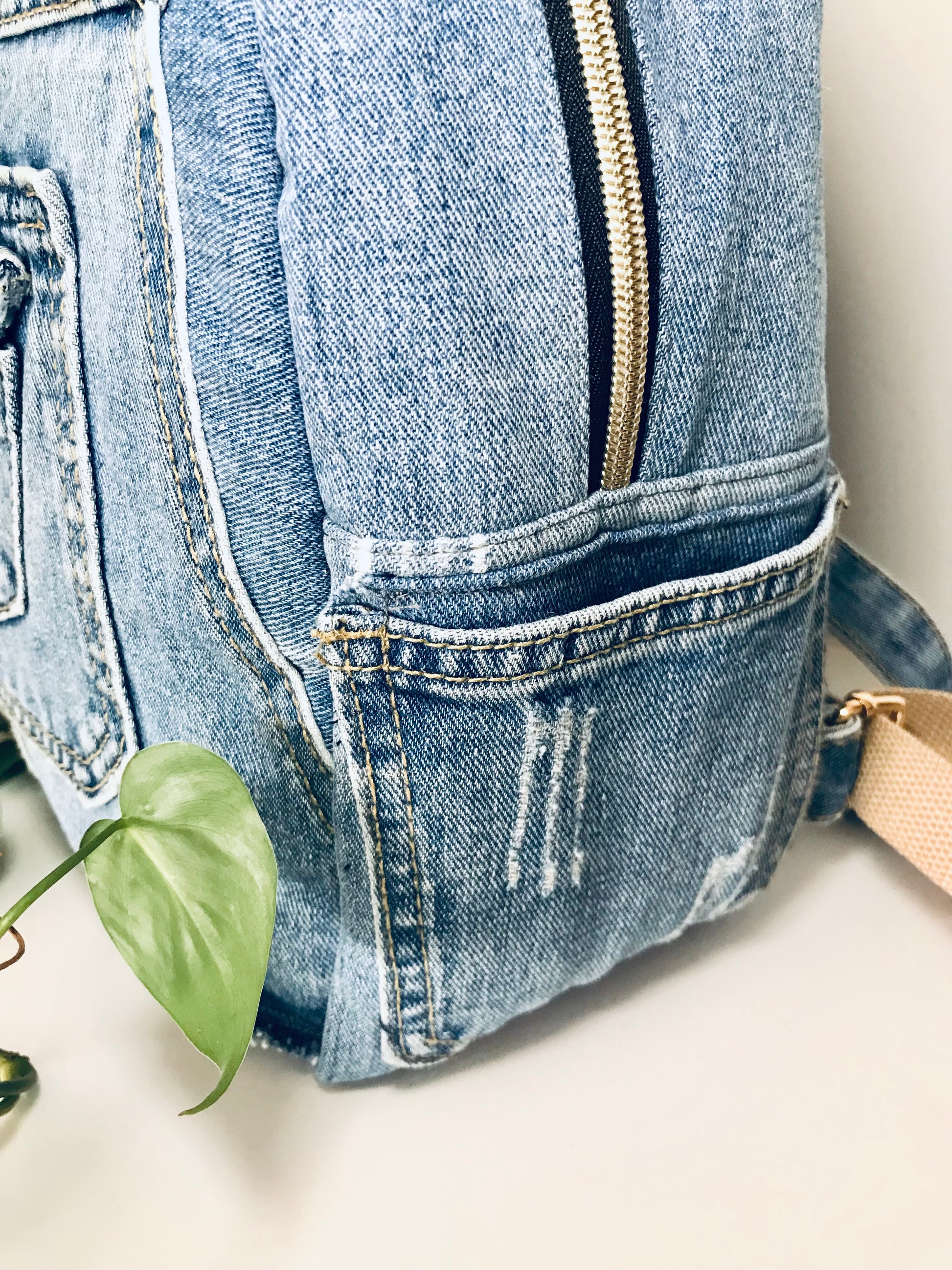 This classic denim mini backpack just oozes practicality and charm! It features the front of a pair of denim overalls, comfortable adjustable straps and a hand back zipper pocket for stashing things securely. On either side of the backpack are two jeans pockets for extra storage.