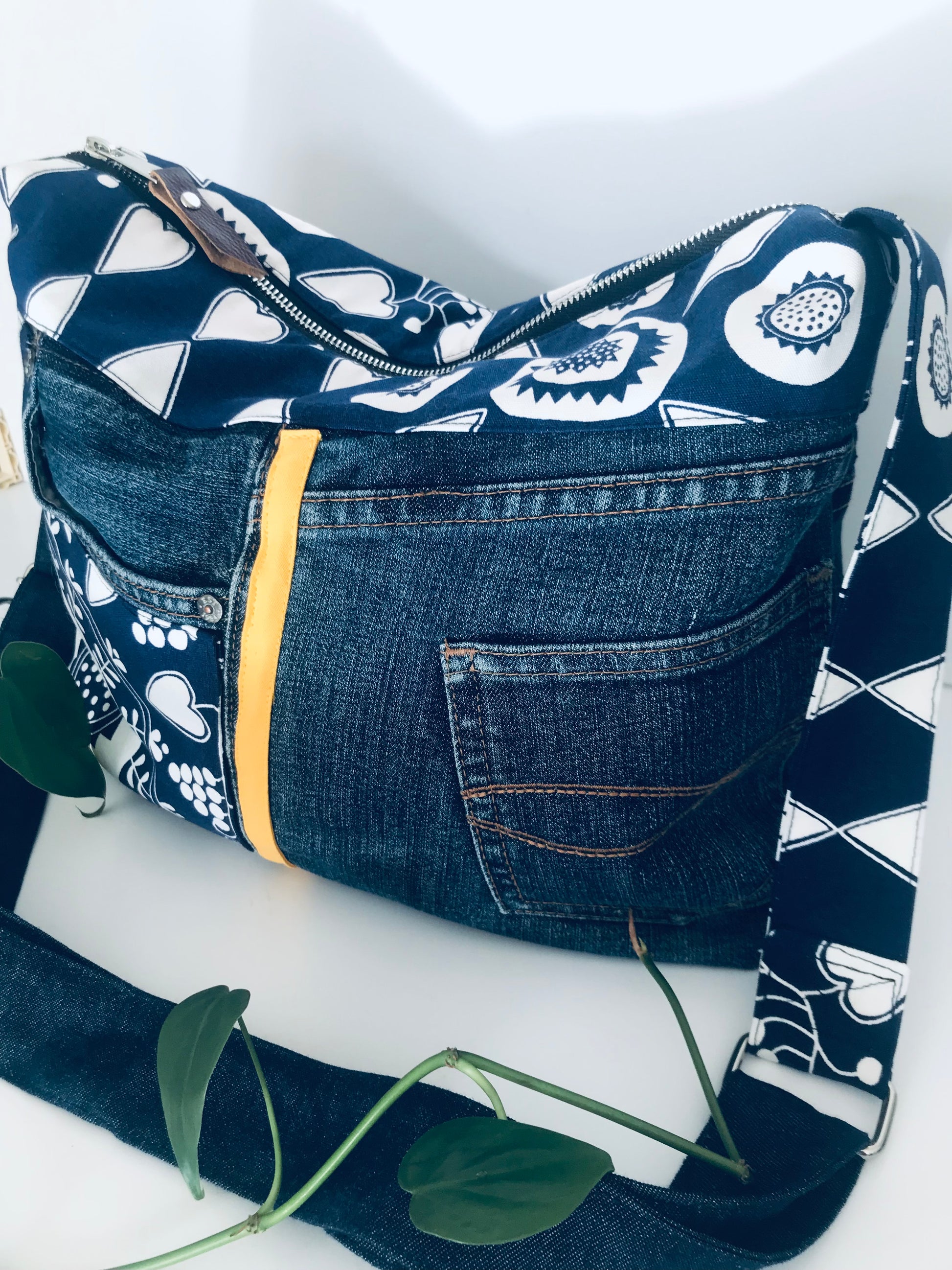 This Conscious Carry-All features remnant fabric showcasing an eye catching botanical print and yellow racing stripe. It also has a long, adjustable denim strap so you can carry this bag on your shoulder or crossbody.
